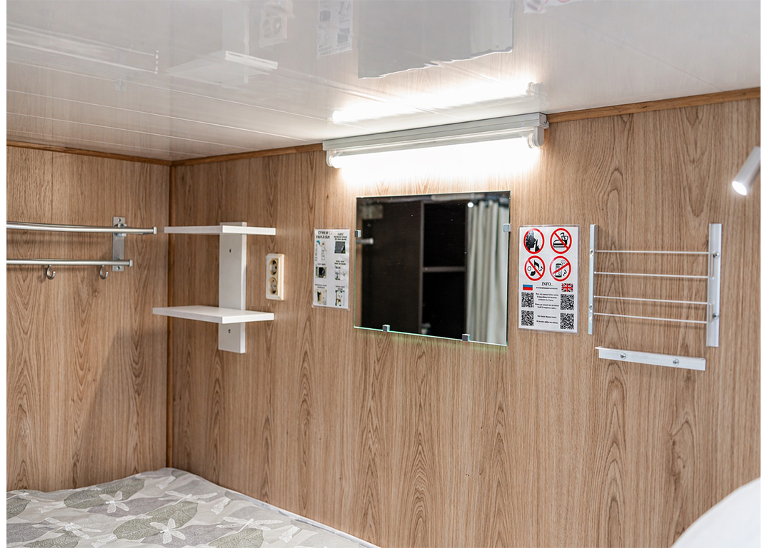 — каждое место оборудовано: двумя розетками, большим сейфом, полками, зеркалом, дневным и ночным светом, местом для двух больших чемоданов. На кухне, каждому, сделан вместительный шкафчик, для продуктов не требующих холодильника.