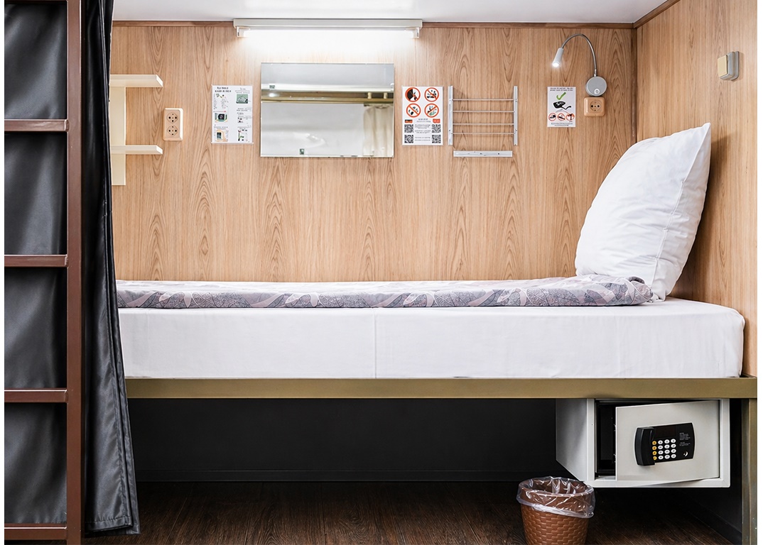 По сути, получаете мини-комнату вместо привычного койко-места, полно места для хранения вещей и одежды, сейф даже.